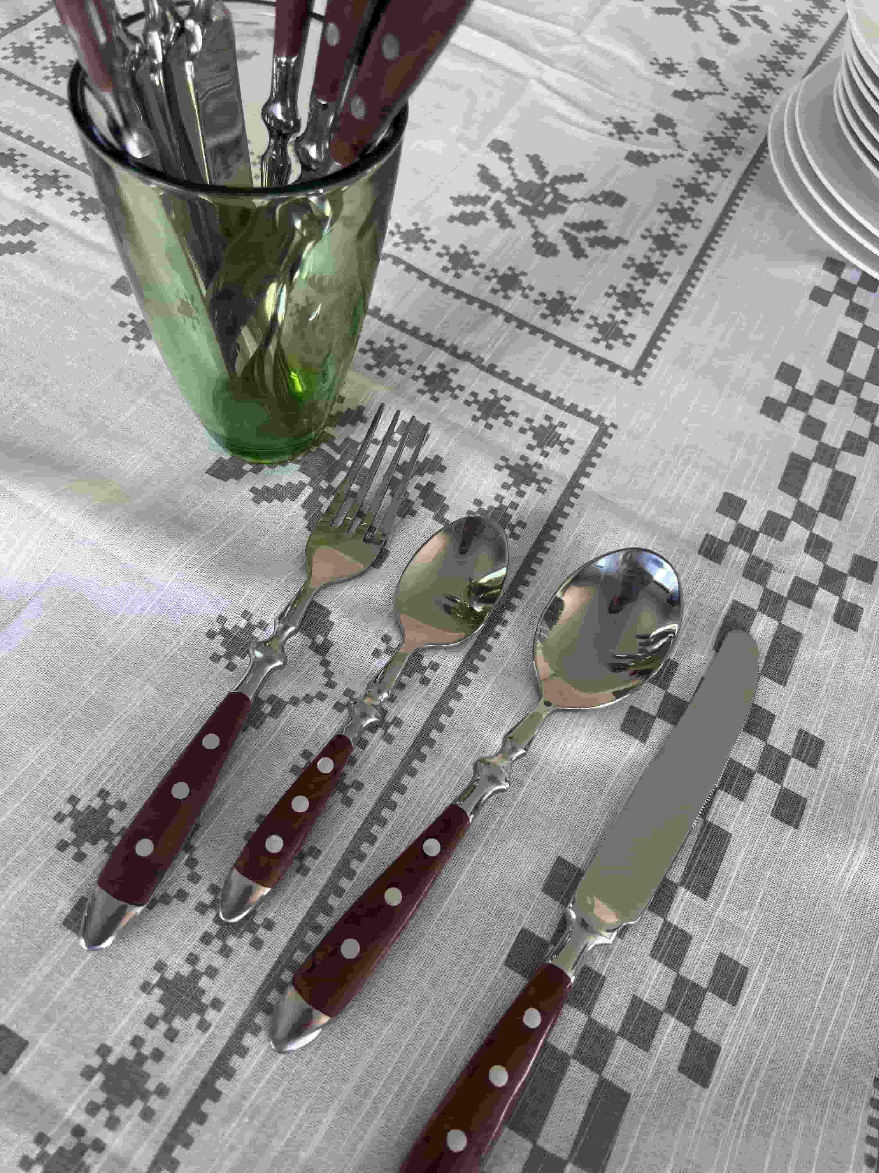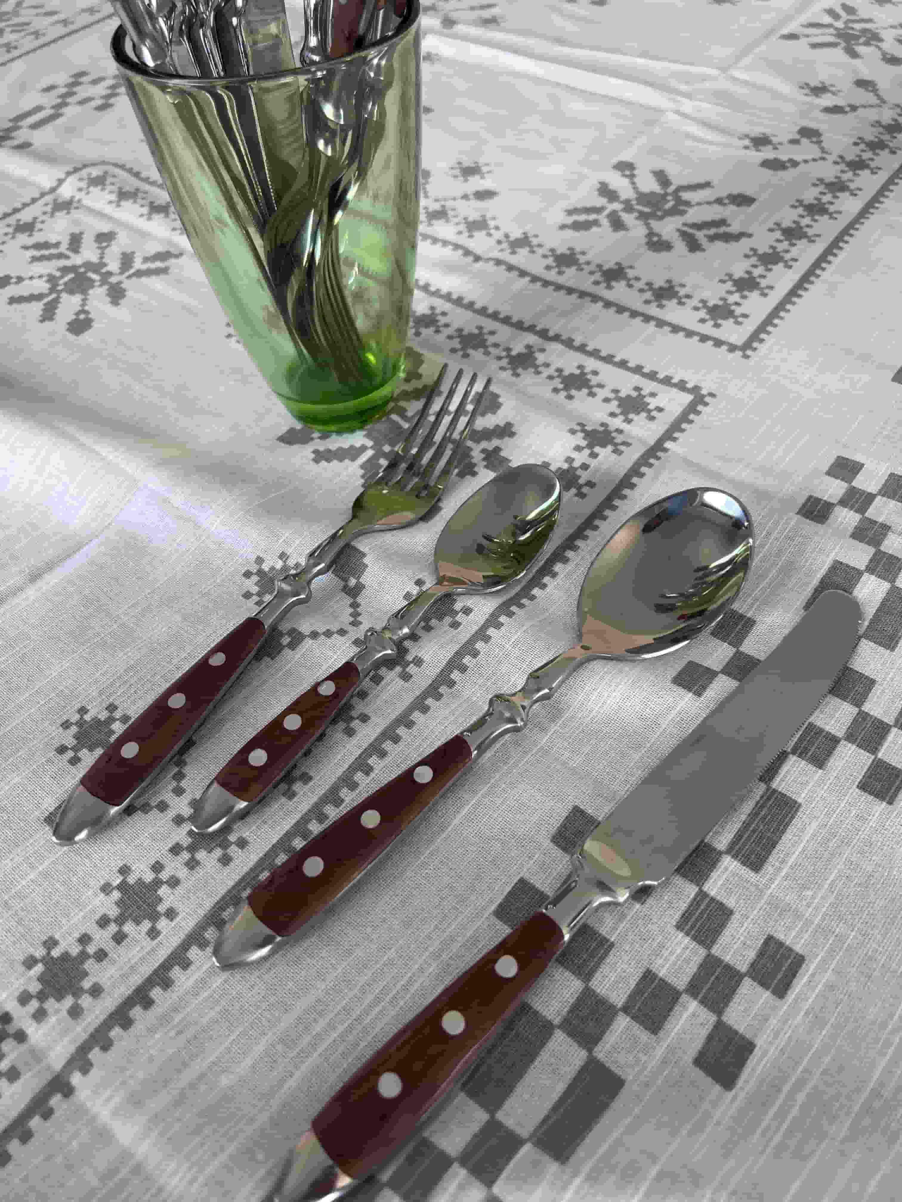 Introducing our Winchester Crest 18/10 Stainless Steel Cutlery Set for 6 with Rivets Handle, a sophisticated addition to elevate your dining experience. This 24-Piece Flatware Set combines the timeless appeal of 18/10 stainless steel with the classic charm of riveted handles and full-tang construction. The result is a set that effortlessly balances durability and elegance. Whether you're hosting an indoor dinner party or enjoying a meal in the great outdoors, this set is the ideal choice. The sturdy construction ensures long-lasting quality, while the riveted handles add a touch of rustic charm to any tabletop. Upgrade your dining decor with our Winchester Crest Resin and Stainless Steel Cutlery Set, and make every meal a memorable experience.