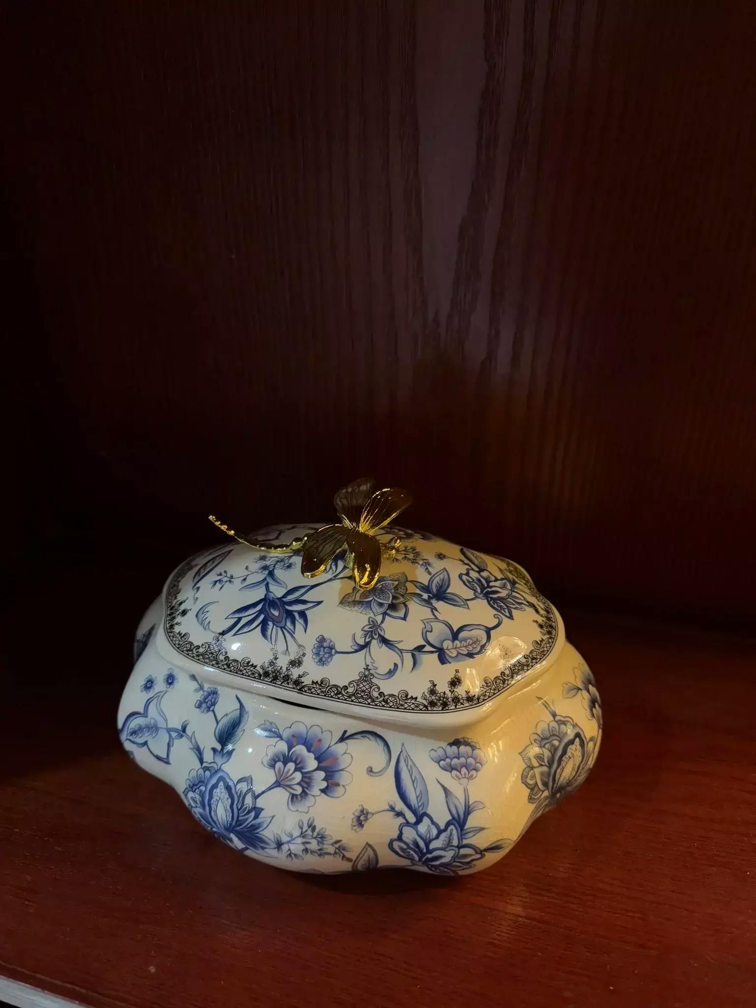 Perfectly sized at 22.5 x 18.5 cm, this trinket box is ideal for storing your cherished keepsakes, jewellery, or small treasures. Whether displayed on a vanity, bookshelf, or coffee table, its timeless design makes it a captivating decor piece that enhances any room. Crafted with care and attention to detail, this porcelain box is not just a storage solution but a work of art that brings beauty and refinement to your home. Treat yourself or gift it to someone special—this trinket box is sure to be treasured for years to come.
