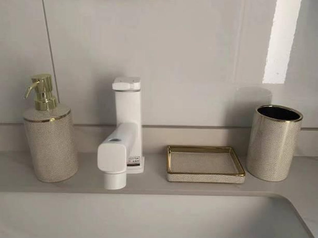 Elevate your bathroom with a touch of timeless elegance. Our Ceramic Bathroom Accessory Set comes in two options: a 4-piece set featuring a soap dispenser, soap dish, and two toothbrush cups, or a 3-piece set with the same essentials minus an extra toothbrush cup. Crafted in a beautiful gold and cream white combination, each piece features a charming dotted design across its body. This set adds a touch of sophistication and functionality to your bathroom countertop.
